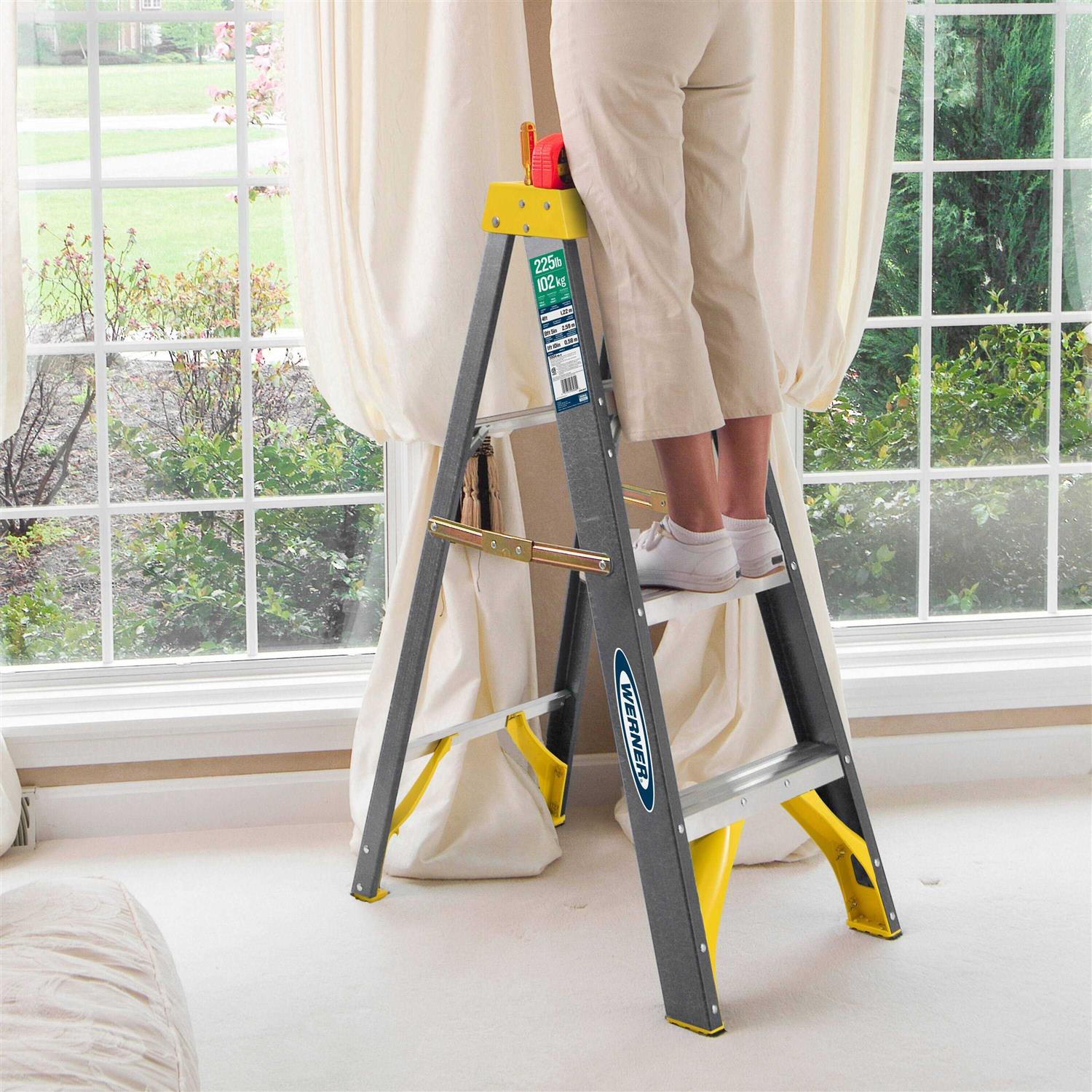 4 ft. fiberglass step ladder offers a 3-step design that features a convenient ladder top for quick and easy access to tools while you work. Its non-conductive fiberglass rails offer a safe choice for working around electricity, while the durable aluminum rungs provide secure footing when climbing. Designed for safety and stability, it also features slip-resistant Traction-Tred steps and slip-resistant molded foot pads, keeping the ladder secure on a variety of projects, from painting or hanging curtains to renovations and more.