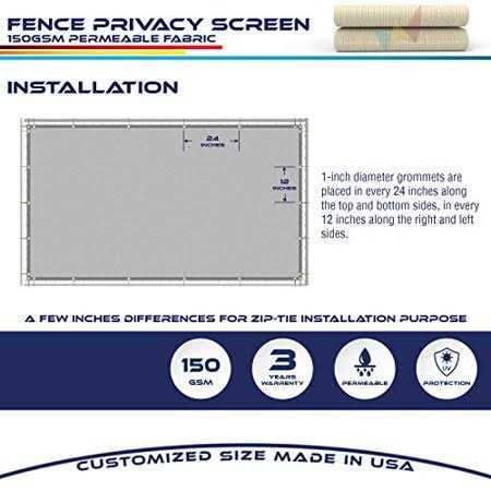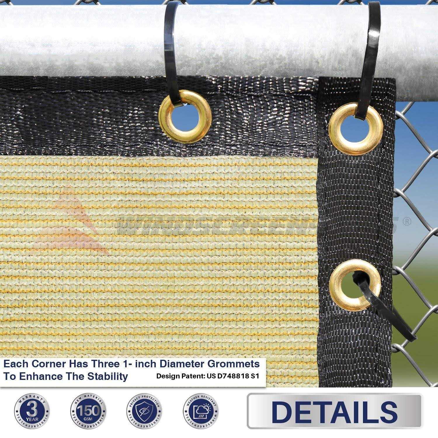 Product measures exactly 50′ long x 5’8″ tall, perfect fit for a fence that’s 6 ft tall. Constructed of new high density material- polyethylene, allows maximum air to go through. Prevents harmful UV sun lights from damaging for up to 90%, and fabric has a 2.5” enforced binding, so it’s able to hold up even in extreme weather condition. 2 grommets on each side of fabric to ensure strength, and it’s easy to install.