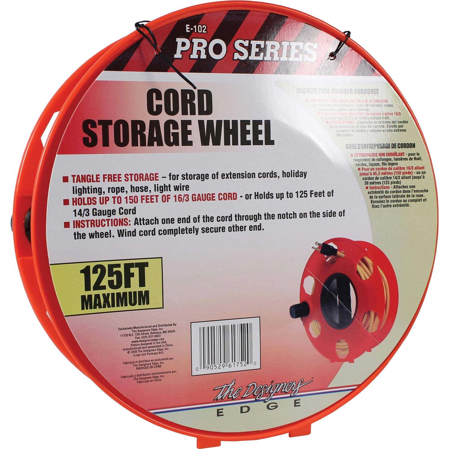 Eliminate the clutter and achieve a neat and organized appearance with this Designers Edge E102 125′ Extension Cord Storage Wheel. It’s made of rugged materials in a bright red color for easy identifying. It features a middle handle and an outside knob, as well as a raised base that keeps it positioned in place for effortless use. It’s ideal for general and tangle-free storage of extension cords, holiday lights, rope, light wire, coax cabling and more.